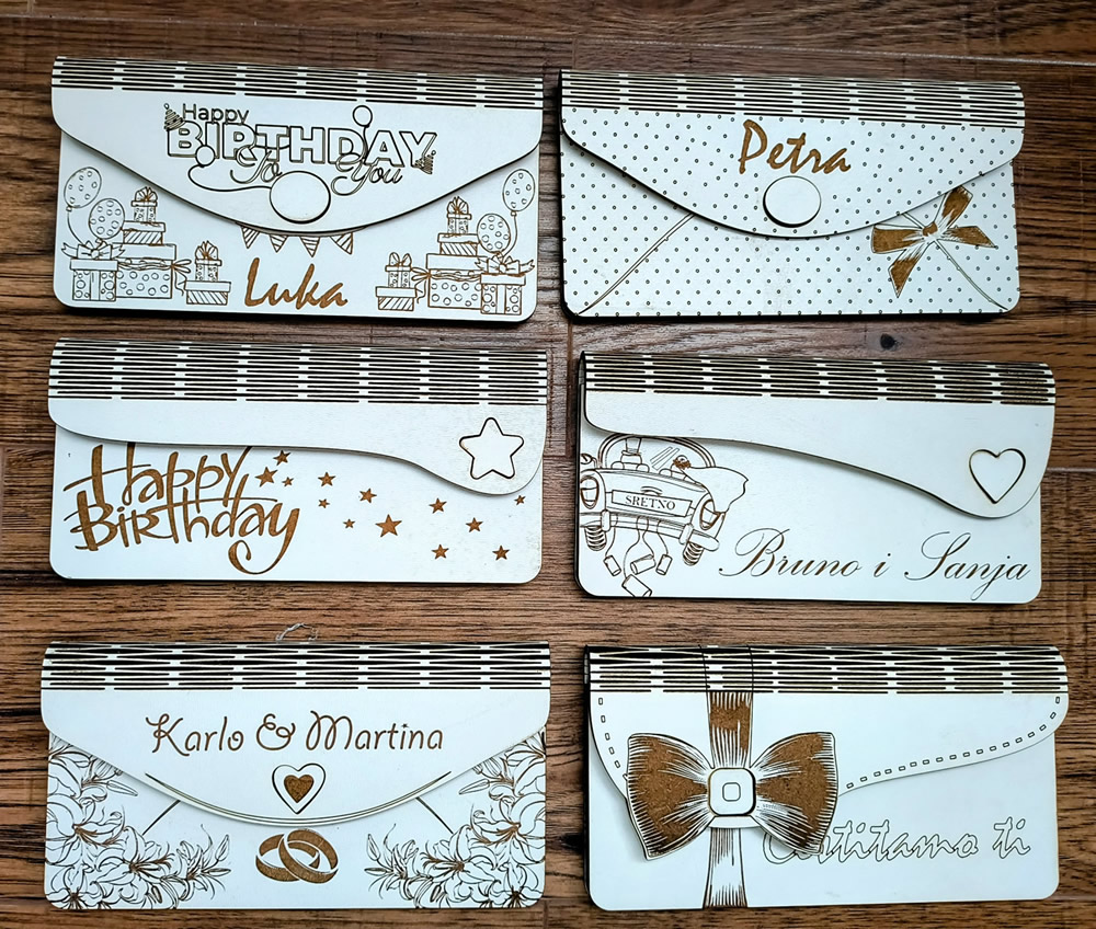 Satovi, daske za rezanje i tacne za serviranje, daske za zid, drvena knjiga za uspomenu, drvene koverte, drvo života, krug obitelji, majčin dan i dan očeva, pokloni za mirovinu.